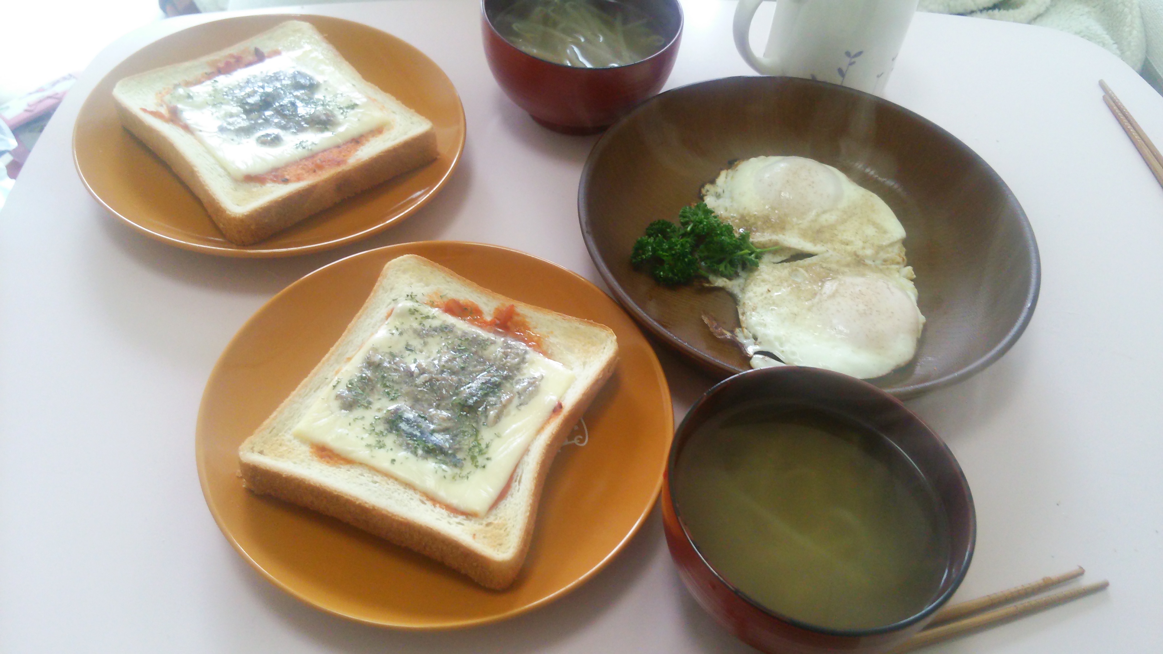1日に同じ場所で3ステージをこなすため、スタミナ切れにならないよう朝食をしっかり摂る。目玉焼き・ほぐしオイルサーディンのピザトースト・もやしの黒胡椒スープというラインナップ。目玉焼きにパセリが添えてあるが、うちの食卓では栄養不足解消の切り札として冷蔵庫のブルペンで常に肩を作らせております。